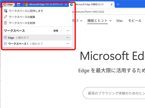 ワークスペースは、作業ごとにタブを保存しておけるスペースだ。たとえば、自分が携わっているプロジェクトのWebページやチャットスペースなどのタブを保存しておけば、ワークスペースを開くだけで、関連する複数のタブをすぐに開ける。タブグループのうち、常用するものをワークスペースとして保存するという使い方が多いだろう。