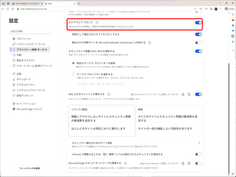 セキュリティ関連機能としては、「Edge Secure Network VPN(5GBまで無料)」を利用できたり、パスワードの流出をチェックしたり、頻繁にアクセスしないサイトにアクセスした際に自動的にEdgeのセキュリティモードを「厳重」に切り替えたりと、さまざまな機能が搭載されているが、注目されるのは「スケアウェアブロック」だ。