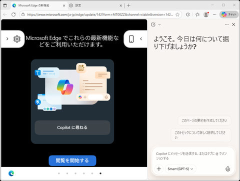 Edgeの右上にある「Copilotボタン」をクリックすることで、サイドバーにCopilot画面が表示される。チャットに関しては、GPT-5(2025年12月現在)を利用できるうえ、Bingを組み合わせた検索機能が利用可能となっており、インターネット上の情報も活用した幅広い回答に対応している。