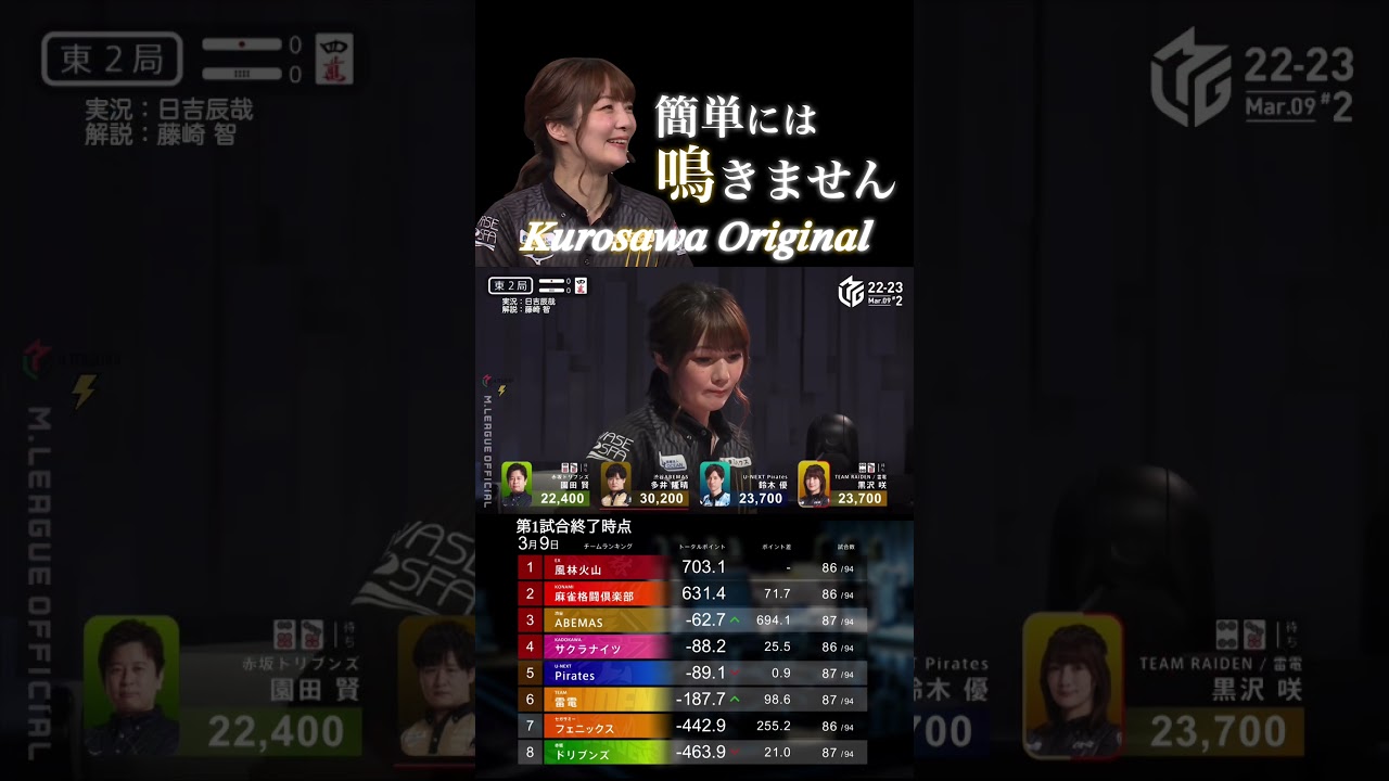 2022-23シーズン 3月9日 第2試合 東2局0本場 東家 赤坂ドリブンズ 鈴木たろう 南家 渋谷ABEMAS 多井隆晴 西家 U-NEXT Pirates 鈴木優 北家 TEAM雷電 黒沢咲実況 日吉辰哉 解説 藤崎智#黒沢咲 #麻雀 #Mリーグ #Mリーグ切り抜き #TEAM雷電 #チーム雷電 #電電 #TEAM雷電Mリーグチーム雷電鈴木咲雷電