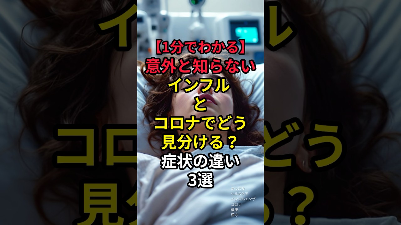 1分で分かる。意外と知らないインフルと コロナで同分症状の違い参戦。この チャンネルではあなたの健康をお願います 。チャンネル登録してこの冬もまったり 感染症絡を守りましょう。症状が似ていて 判別が難しい。判別が難しい インフルエンザと新型コロナ。今日は判断 のヒントになる3つの違いを紹介します。 その1発症スピードが違う。 インフルエンザは数時間で急激に悪化。朝 は元気でも夜から急激に発熱して39°に 達することもある。コロナはゆっくり症状 が強くなることが多い。その2症状の中心 が違う。インフルエンザは高熱を換金に 苦痛関節痛を訴える方が多く全身症状が 強い。コロナは咳、喉の痛み、味覚休障害 といった起動症状が目立つことが多い。 その3感染期間の長さが違う。 インフルエンザは発症3から5日に症状の ピークが来ることが多い。コロナは比較的 に長めで8勝7から10日持続することも ある。回復しても積田だけ長引くのが コロナあるあるである。急激な全身症状と それぞれの石&喉のトラブル持続といった 特徴はあるものの、下はずにこの時