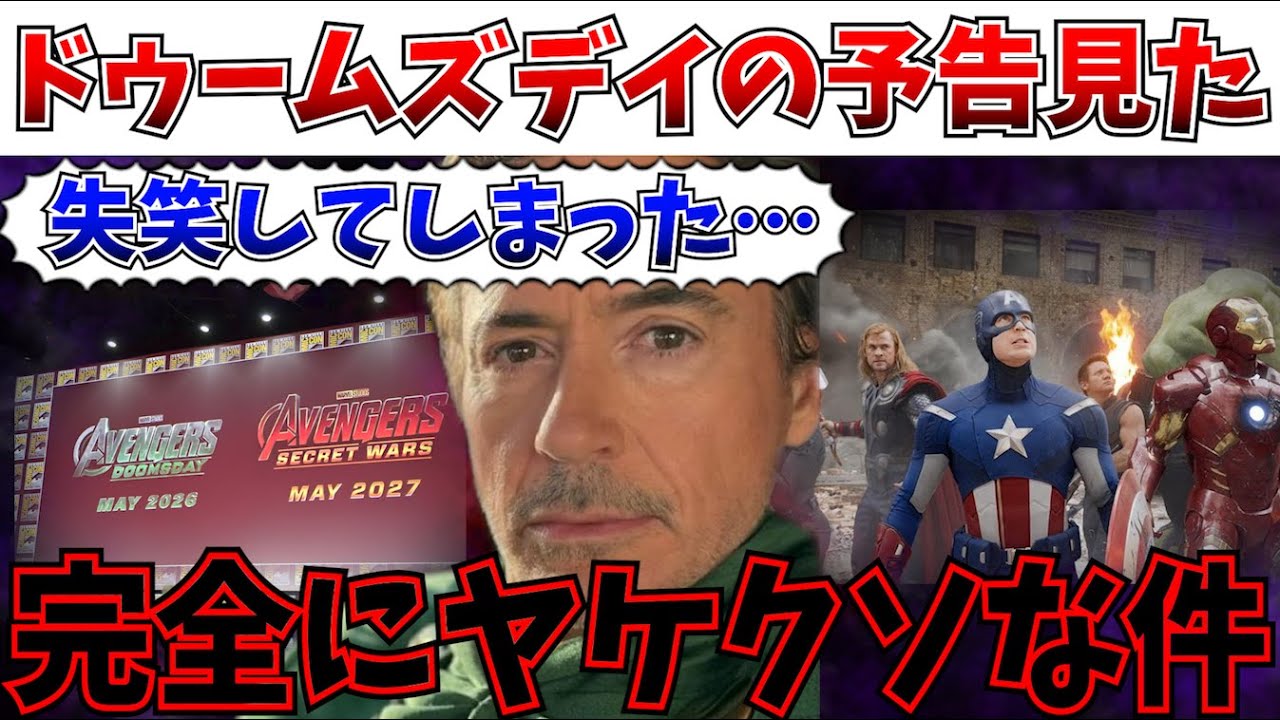 分離主義勢力の諸君ご機嫌よ。行かれた 動画にようこそ。ここは地獄だ。さて、 今回の日さだな。アバターファイヤー &アッシュ上映前に アベンジャーズドームズデー の予告が流れ散らかしたというところでだ 。これについてこのIQ3.3兆の俺様が 語り散らかしていこうと思うぞ。 耳の穴かじ 一体全体何がどうなっているのかという ことだな。まず始めにだ。この動画では アベンジャーズドームズの予告編に関する ネタバレがあるのでネタバレたくないと いう人は大なしくうん。他の動画を見て 欲しいな。ま、とは言ってもぶっちゃけ この動画を再生しているようなやつの ほとんどは、ま、今回のね、ドームズデー の予告編の内容なんてもう分かりきって いるとは思うんだけどね。ま、一応念の ために警告だけしておこっかなってところ だね。さて、そんなアベンジャーズデーだ がうん。一応最初にこれ言っとくと俺は別 にこれ目当てで映画館に行ったわけじゃ ない。アバターファイヤー&アッシュ。 これを見たいがために劇場に足を運んだ。 そしてその結果としてたまたま ドームズデーの予告が流れたといった具合 だ。ま、もちろん事前に予告が流れると いうことは分かっていたんだけれども、 決してそれ目当てで言ったわけじゃない。 別にアバターはどうでも良くって ドームズデーのためだけに見に行った興味 のないアバターもついでに見てやるか みたいなモチベーションの人がいてもそれ をね、俺否定する気はないんだけど、 少なくとも俺はそうじゃないっていうこと は言っておきたい。 あの、別にそれやってる人はいいよ。自由 だからね。ただ俺のスタンスとしてはそう いうことはやりたくないので、断じてそう いうつもりではなかったっていうことは 言っておきたいね。てか、そもそもね、 ぶっちゃけた話するとね、俺 Twitterのおすすめ欄にこれ流れて きてしまったせいで、もう内容知ってた からね、あらかじめ。うん。本当にこれに 関してはね、せっかくアバターとセットで ね、予告解禁っていう仕掛けをディズニー がやったにも関わらず、これね、 Twitterのおすすめ欄にね、リーク を流してくるっていう凶悪なね、先般が 現れてしまったことは残念で仕方ないね。 ま、だから本当これに関してはディズニー 100%もう気の毒にって感じだね。うん 。だし、あの、みんなね、見ちゃった人、 この動画を見てる人の中にもいると思うん だけど、その人も気のどにって感じだね。 うん。で、その上で、ま、実際予告見てね 、どうだったのかって言うと、ま、 ぶっちゃけた話をするとね、うん。ま、 そりゃそうでしょうっていうそんな感じだ よね。うん。あのね、別に怒りでもね、 楽胆でもなくってね、今日はずっとこの テンションね、あの、失傷はい。もう いろんな意味で失傷しましたね。 ドームズデー。え、まずね、事実だけ整理 すると、え、今回ね、クリスエヴンス 演じるスティーブロジャーズの復帰が代々 的に告知されました。というか、それを 告知するためだけの予告編が今回 のドームズデーの予告だね。具体的になん か魅力的なシーンが用意されているとか そういうのは一切なくって、あの、普通に スティーブロジャーズは帰ってくるって 言ってクリエバが映されてはい、終わ りっていうもうそれだけの内容です、本当 に。うん。だからぶっちゃけた話をすると もう出落ちですよね。うん。だからもう 事前にこの情報踏んじゃってる人は わざわざ見に行かなくてもいいんじゃない かなって俺は思っちゃった。うん。あのC って言うならあのスティーブが赤ん坊 抱っこしてるのであ、パパになったんだ ねっていうのも読み取れるんだけど ぶっちゃけそこそんなね。うん。ま、俺 からすればどうでもいいっていうレベル感 のことなので、ま、あんまり気にならない かなって感じだからぶっちゃけね、この 予告そんなにあの見る価値あるかって言っ たら、ま、あのあるとは思うんだよ。 間違いなくあるとは思うんだけど、 ぶっちゃけその初見のインパクトに全振り してるので、ネタバレ踏んじゃった人は わざわざ映画館に行かなくても俺はいいか もしんないなって思っちゃった。うん。ま 、情報としてはマジでそれこそ内容を列居 してるネットの記事とかで十分なレベルだ と思う。うん。本当にスティブロジャーズ 復帰しますっていう以上の情報はないので ね。なんかストーリーや映像の面であの 何か気になる要素があるとかっていうわけ でもないので本当にそこ全振りだから。 うん。だも知らずに今行った人は ものすごくテンション上がったと思うんだ けど、もうネタバレ踏んじゃった人はもう 、もうアバターに興味ないんだったらやめ た方がいい。うん。そんな感じですね。 ぶっちゃけ予告の構成として何度も見返し たくなるようなタイプじゃないし。 アバター見てたら普通に存在事忘れる ぐらいには内容薄かったね。うん。そんな 感じがしましたね。予告の