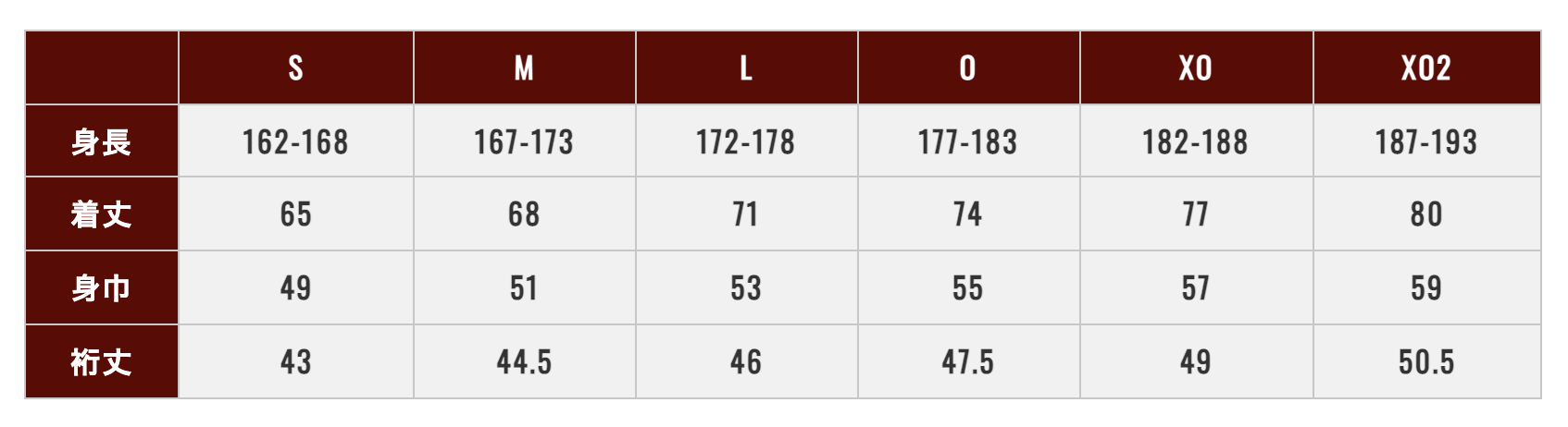 サイズ:S/M/L/O/XO/XO2