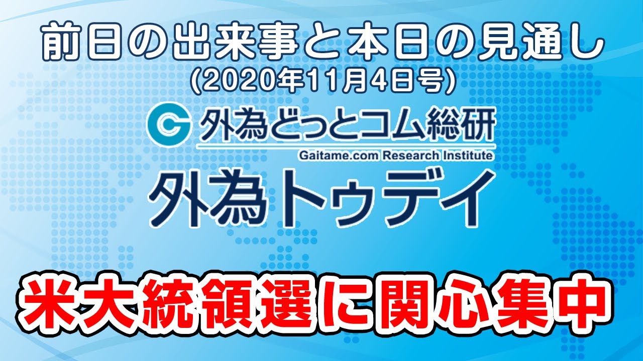 本日は米大統領選挙の結果に市場の関心が集まっている。昨日の海外市場では、バイデン氏の勝利を織り込む形で株高・ドル安が進行。ドル/円はドル売りと円売りが交錯する中で104.40円台へと小幅に下落した。順調に開票が進み、本日午後にバイデン氏の勝利が確定的となれば、多少の乱高下はあってもドル/円には昨日と同じく明確な方向感は出ないかもしれない。