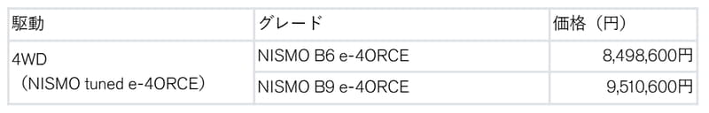 日産自動車は1月29日、2025年12月に発表したBEV(バッテリ電気自動車)「アリア NISMO」のマイナーチェンジモデルの価格を発表した。価格は「NISMO B6 e-4ORCE」が849万8600円、「NISMO B9 e-4ORCE」が951万600円。発売はいずれも3月19日。