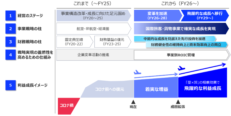 2026-2028年度は着実な増益を継続しながら、変革を加速、成田空港の拡張へ備える期間とし、2029年度以降は飛