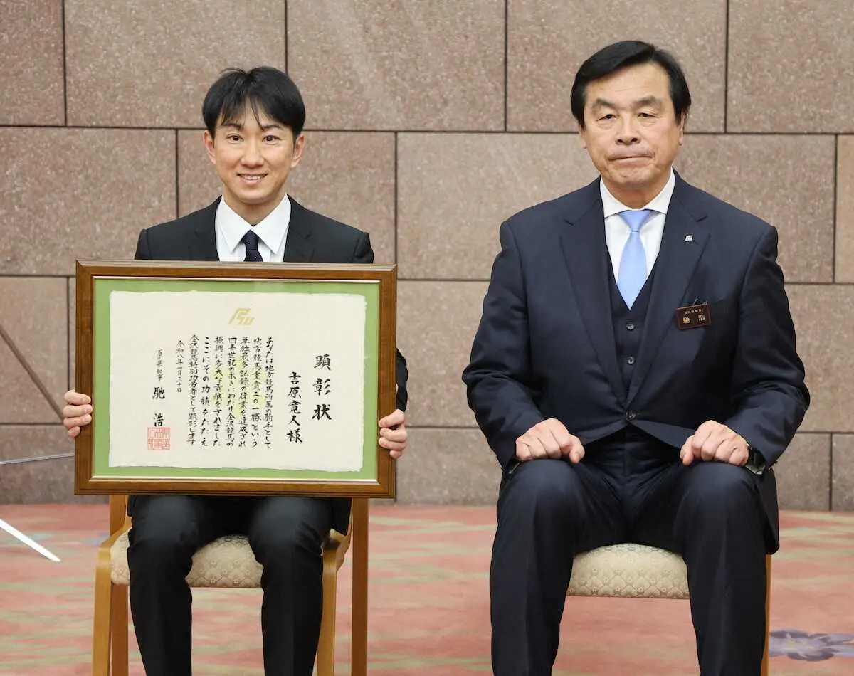 石川県競馬事業局によれば、金沢競馬特別功労者顕彰式が30日、行われ、地方競馬重賞201勝の最多記録をマークした吉原寛人騎手(42)に対し、馳浩・石川県知事から顕彰状、記念品が贈呈された。