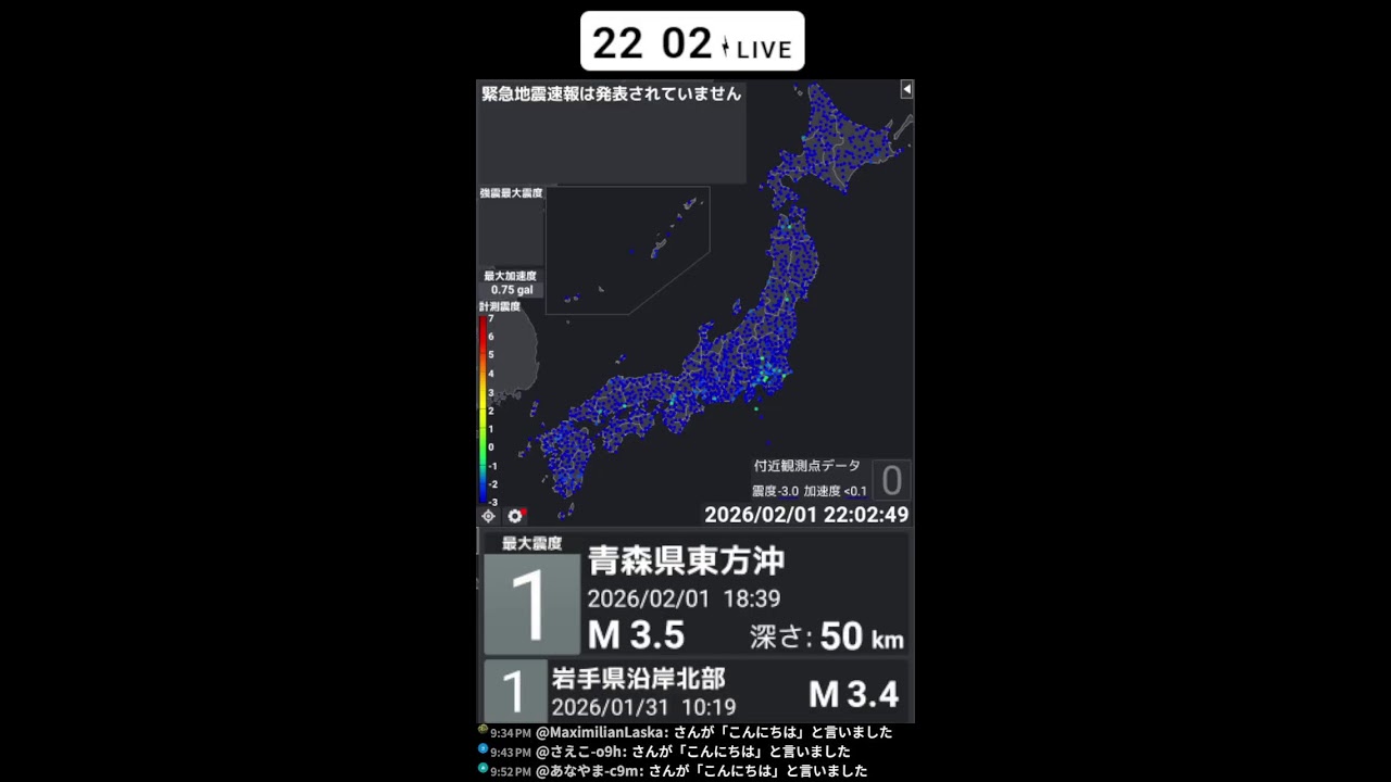 地震情報配信2/1/20:00~2/2/7:30