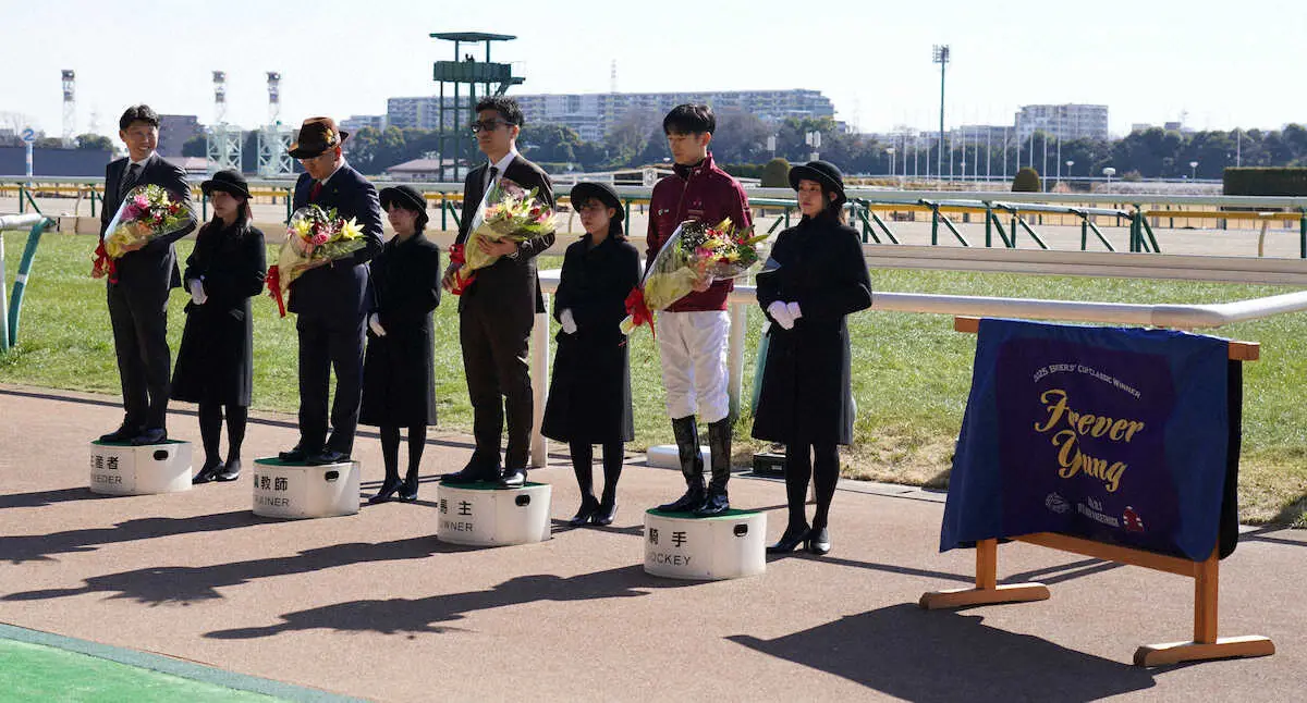 日本調教馬として初めて米BCクラシックを制したフォーエバーヤング(牡5=矢作)の関係者優勝記念セレモニーが1日、東京競馬場のウイナーズサークルで4R終了後に行われた。
