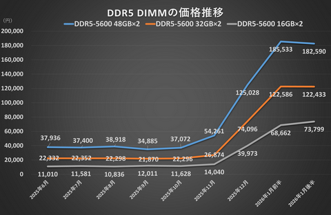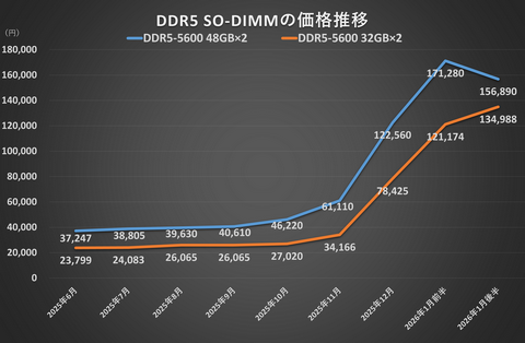 2025年11月から起きた大幅な値上がりは、2026年1月前半でも続いた。DDR5-5600の48GB×2枚は安かったころに比べると平均価格は15万円以上もアップ。約5.3倍も値上がりしてしまった。売れ筋といえる16GB×2枚も11万円以上、同じく約5.3倍の値上がりだ。