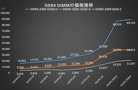 しかし、2026年1月後半になるとほぼ横ばいになった。DDR4も同じ傾向で、値上がりの頂点は過ぎた感がある。とはいえ、しばらくは供給不足、品不足が解消される見込みはないため、このあたりの価格が続くのではないだろうか。なかなか厳しい時代だ。