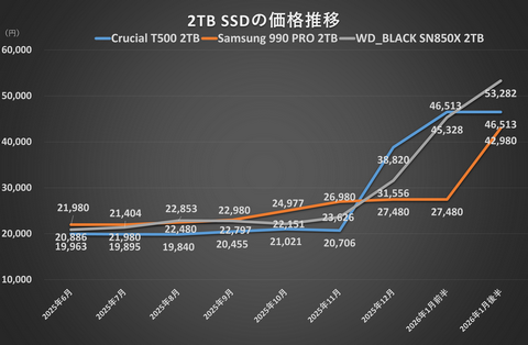 メモリとは異なり、SSDは値上がり傾向が続いている。メモリほど極端ではないが、2025年の夏に比べるとどの容量でも約2倍ほど価格はアップした。どこまで値上がりが続くのかまだ見えない状況だ。Crucialブランドは唯一1月の前半と後半で横ばいになっているが、2026年2月に撤退が決まっているため、市場から在庫が消えるのは時間の問題だろう。