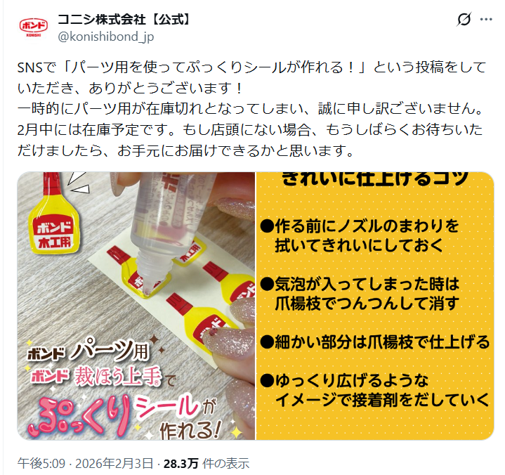 「ぷっくりシール自作に最適」SNSで話題のボンド品薄、コニシが謝罪「2月中には在庫予定」 ITmediaロフト、「ボンボンドロップシール」販売見合わせへ「全国的な品薄と混雑防止のため」(オリコン) Yahoo!ニュース令和のシールブーム「子供のイジメ問題」が深刻化 現代ビジネスぷっくりシールを100均×コンビニで作ろう – 生成AIでこの世で唯一のシールも dメニューニュース“ボンドロ”(ボンボンドロップシール)がほしい!静岡県内でも品薄状態が続くほどの人気!一体、どこで買えるの? at-s.com