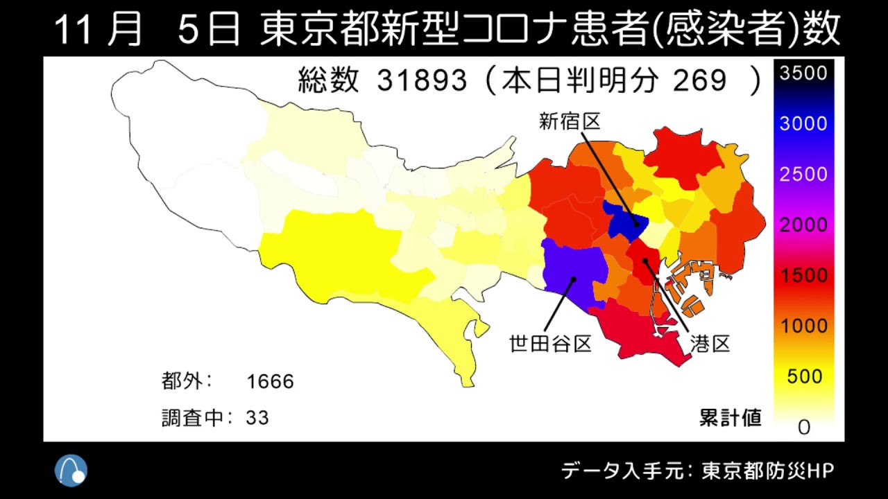 東京都の新型コロナ患者数(感染者数)マップの動画を不定期で更新中。報道される『感染者数』とは、実際には、陽性判定の人数『患者数』です。11/6時点で累計32,135人となります。このマップも患者数であり、本来の感染者数とは異なりますが、拡大傾向を把握できます。 データは、東京都防災ホームページ『東京都新型コロナウイルス感染症対策本部報』の区市町村別患者数(都内発生分)から取得しました。 最新のマップはこちらでも見られます: COVID-19NewsVideoコロナマップ地図患者数感染者数新型コロナウイルス感染症東京東京都新型コロナウイルス患者数感染者数マップ