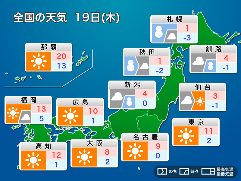 明日2月19日(木)の天気予報 西日本や東日本太平洋側は日差しが届く 北海道は積雪増加に注意 ウェザーニュース18日夜に寒冷前線が東北日本海側を通過 積乱雲発達で「ひょう・落雷」の恐れ 19日明け方にかけて激しい突風に注意 Yahoo!ニュース今日2月19日(木)の天気予報 北海道は強雪や吹雪に注意 西日本や東日本太平洋側は晴れる au Webポータル明日19日朝まで日本海側は吹雪 3連休は行楽日和 季節先取りの暖かさで20℃超も(気象予報士 石榑 亜紀子 2026年02月18日) tenki.jp日本海側で雪や雨が降り出す 雷やアラレにも注意 ウェザーニュース