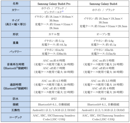 <主な仕様 : 「Samsung Galaxy Buds4 Pro」「Samsung Galaxy Buds4」>