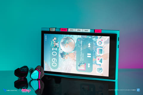 筐体デザインは、初音ミクをテーマにした限定カラー仕上げ。ミクを象徴するペールブルーグリーンを基調に、側面の物理ボタンに鮮やかなピンクレッドを組み合わせた。出力端子は3.5mmシングルエンドと4.4mmバランスの2系統。