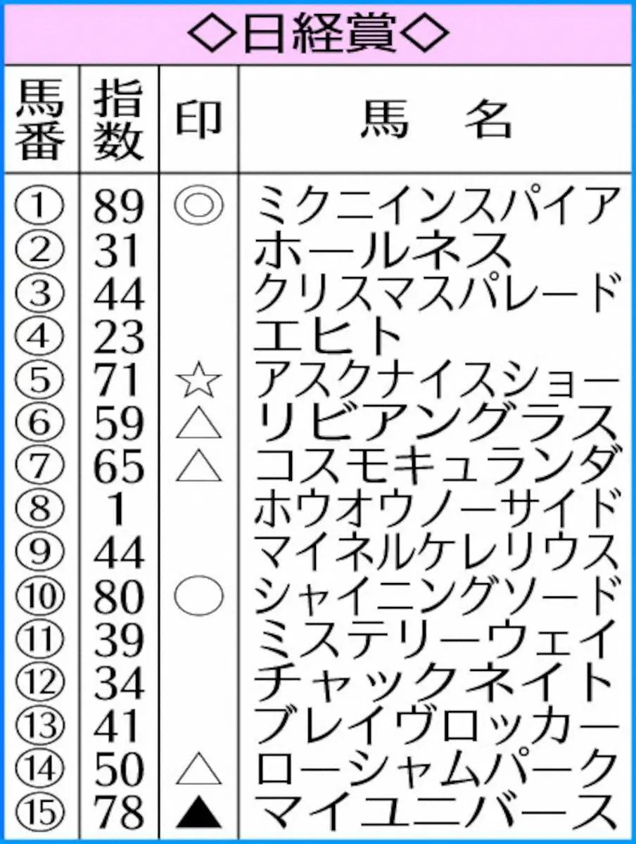 本命は指数89のミクニインスパイア。昨夏函館の未勝利勝ちを皮切りに破竹の4連勝で一気にオープン入り。直近2戦は今回と同じ中山2500メートルで完勝。2着馬もいずれも既にオープン入りと、対戦レベルも高い。2走前の勝ちタイム2分30秒5は有馬記念でも通用するレベルだ。