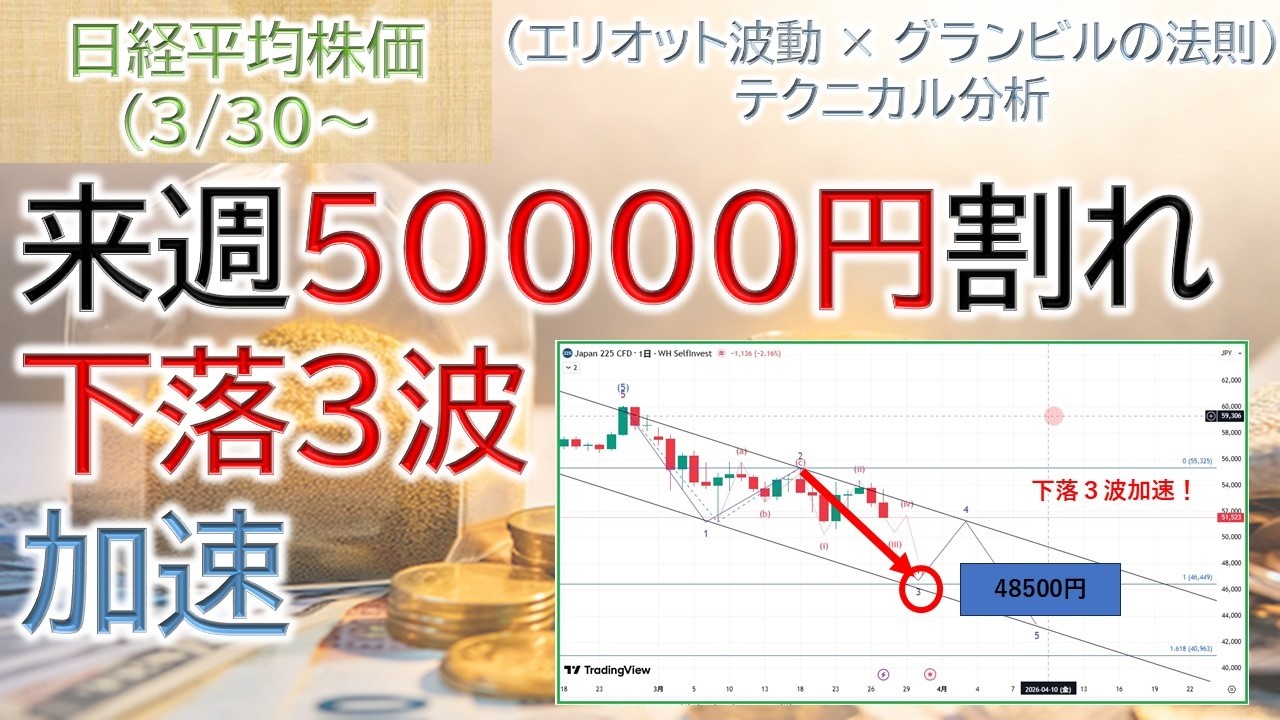 【警戒】日経平均ついに5万円割れへ|下落3波で一気に加速か【3/30~日経平均株価予想】