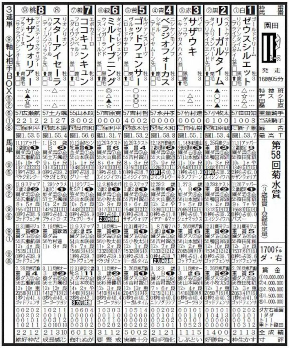 園田競馬のメーン11R「第58回菊水賞」(1700メートル)は、きょう2日午後4時5分ゲートイン。飛躍を期す強豪3歳馬が集結した。本社予想・桑原勲記者はサザンウォリアーに本命を託した。