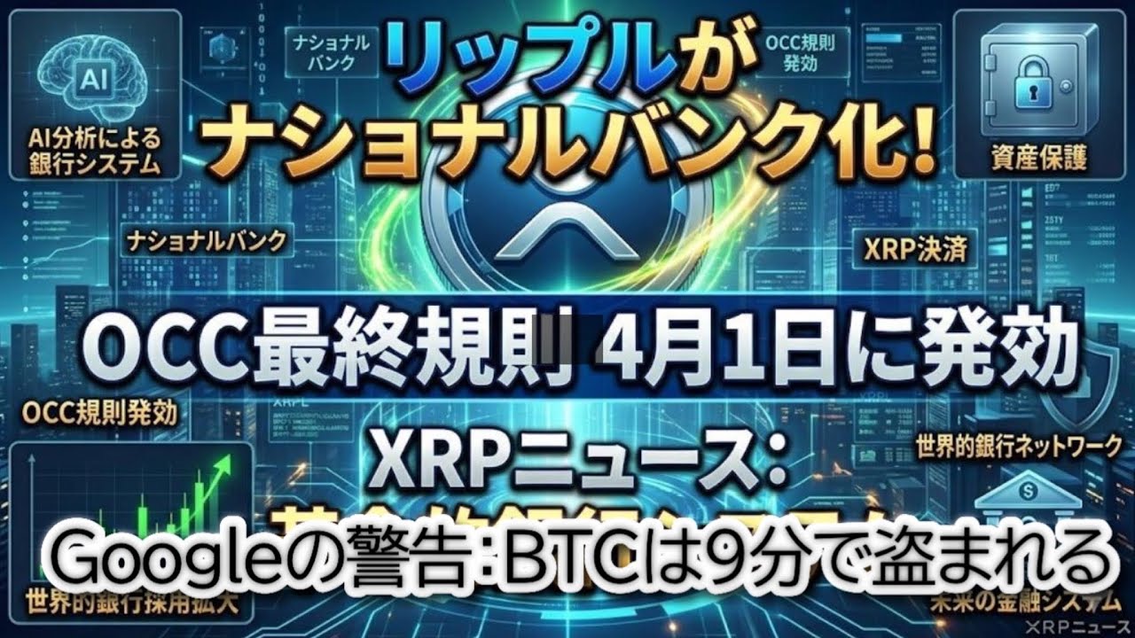 仮想通貨市場に激震!2026年4月1日、米国OCC(通貨監督庁)の新ルール施行により、リップル社が「国立銀行」としての地位を確立しようとしています。さらに、Googleが発表した衝撃のレポートでは、ビットコインやイーサリアムが量子コンピュータによって数分でハッキングされるリスクを指摘。その中で、なぜ「XRP Ledger(XRPL)」だけが安全だと評価されたのか?
