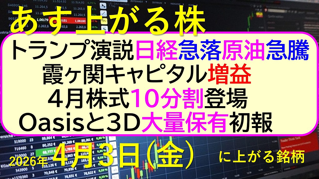 トランプ演説で日経急落、原油急騰。霞ヶ関キャピタル増益。4月、株式10分割。Oasisと3D大量保有~あす上がる株 2026年4月1日(水)に上がる銘柄。最新の日本株情報。高配当株の株価やデイトレ情報