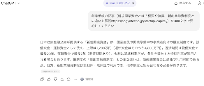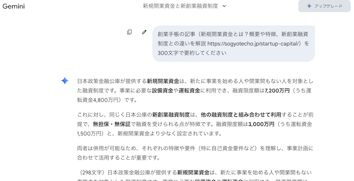 まずはじめに、ChatGPTとGeminiにそれぞれ「新規開業資金とは?概要や特徴、新創業融資制度との違いを解説 https://sogyotecho.jp/startup-capital/を300文字で要約してください」と命令してみました。