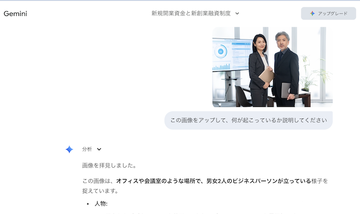 次にマルチモーダルタスクを指示してみます。「この画像をアップして、何が起こっているか説明してください」と命令してみました。