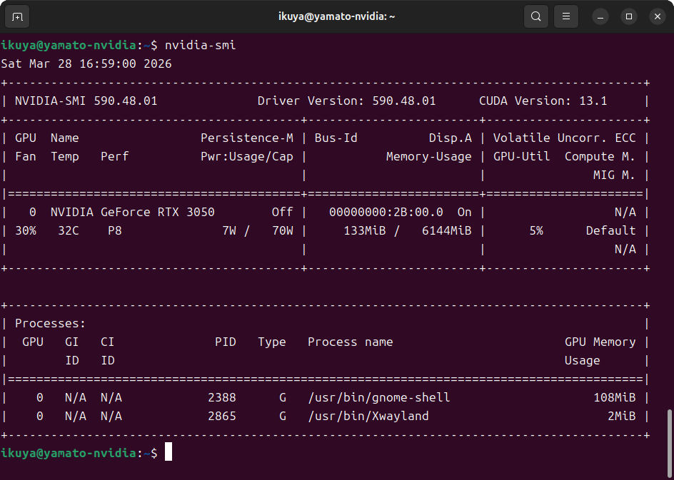 nvidia-smiコマンドでは、なぜか13.1と表示されています(図2)。