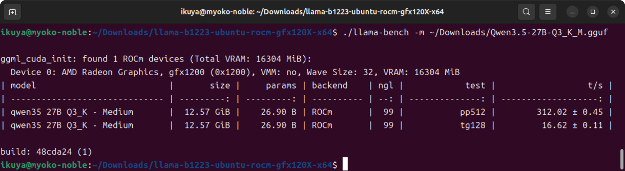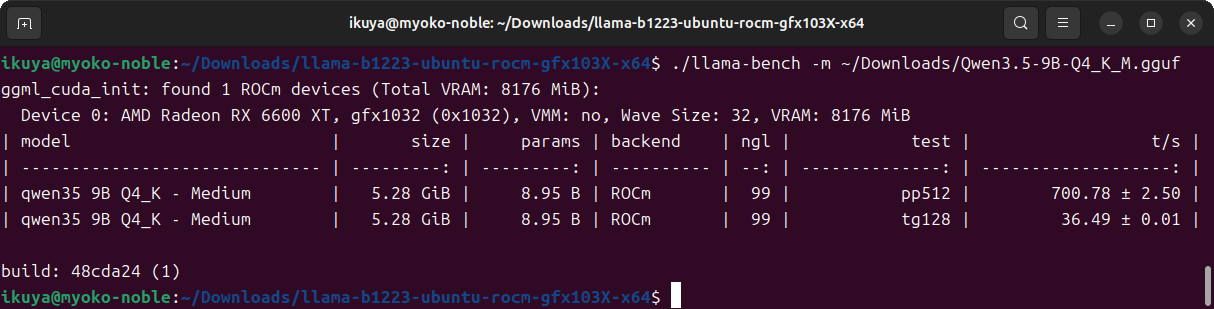 llamacpp-rocmのSupported Devicesによると、Radeon 6000シリーズはgfx120Xということなので、「llama-(リビジョン)-ubuntu-rocm-gfx120X-x64.zip」をダウンロードし、展開します。