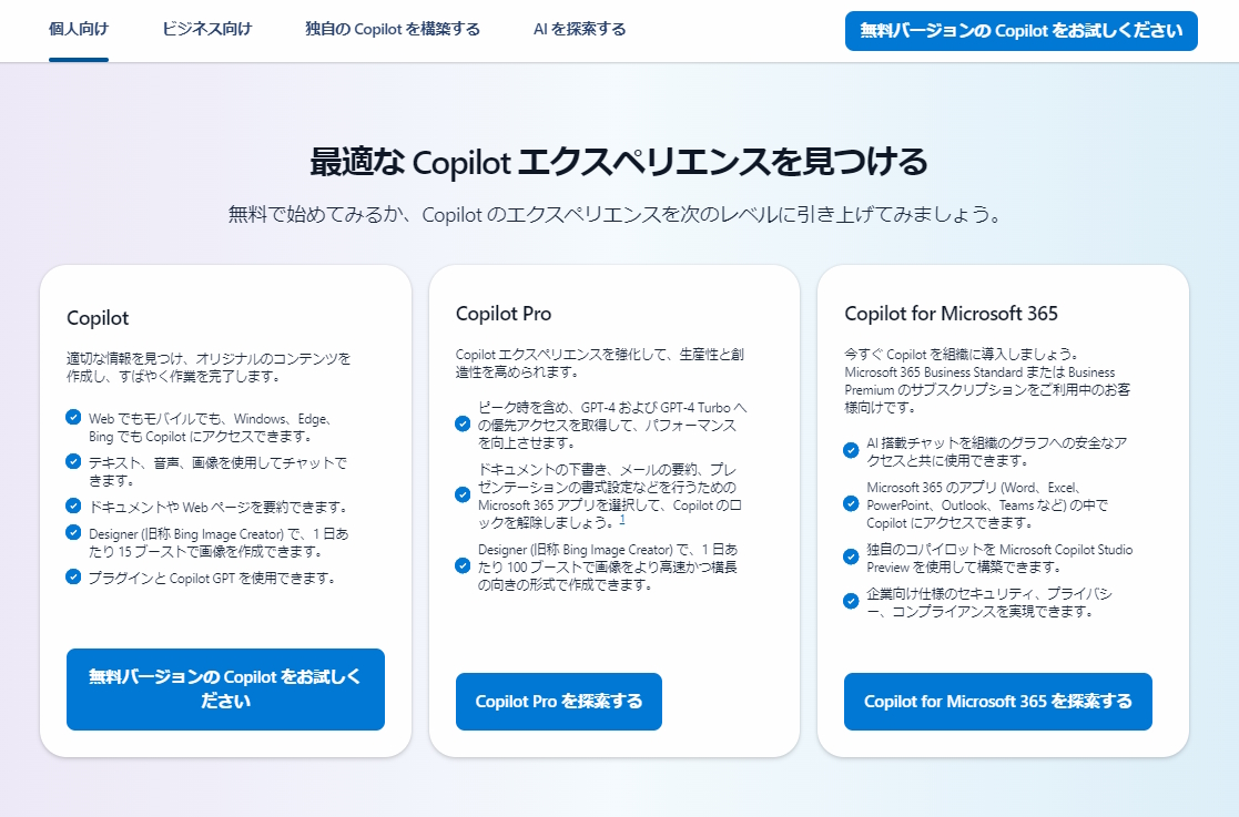 「Microsoft Copilot」主なラインナップ