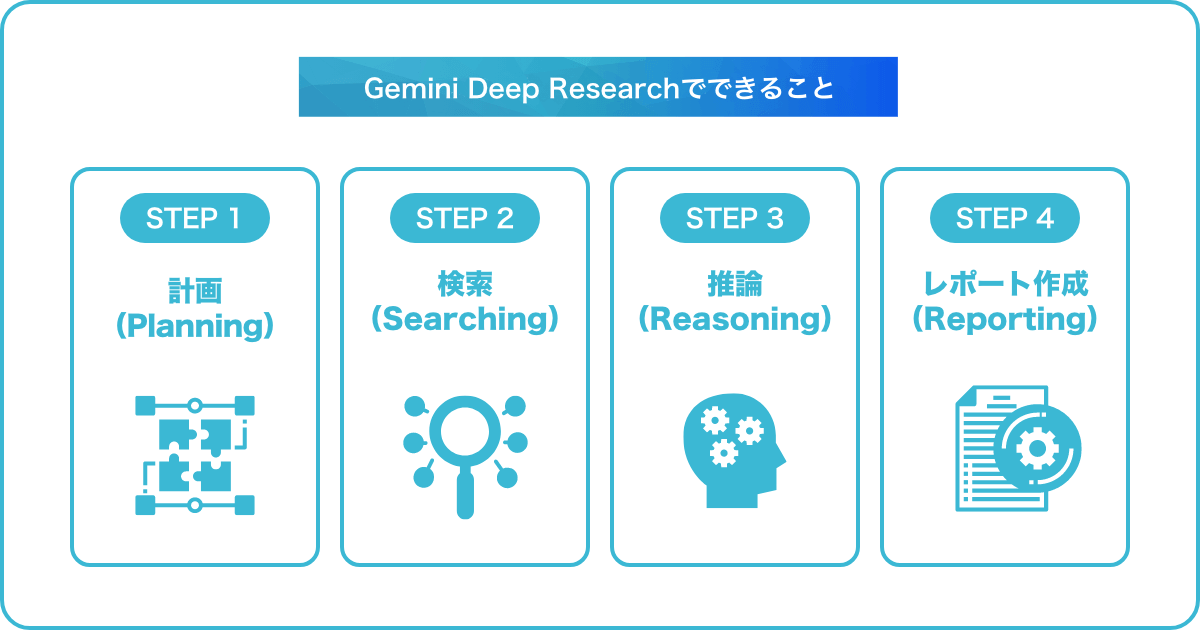 Gemini Deep Researchでできることを4つのステップにわけてご紹介します。