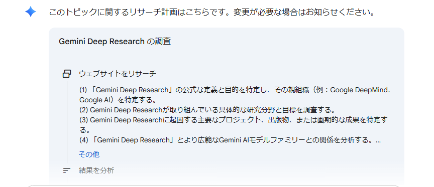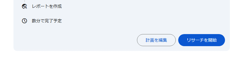 リサーチ計画の確認Geminiがリサーチ計画を自動で立ててくれるため、内容を確認して問題なければ右下の「リサーチを開始」をクリックする