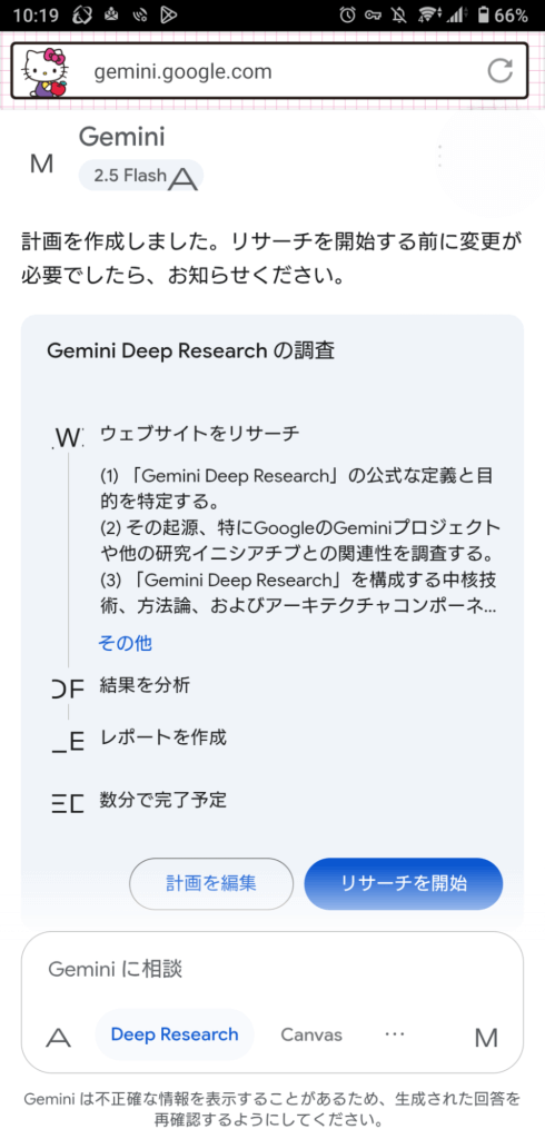 リサーチ計画の確認Geminiがリサーチ計画を自動で立ててくれるため、内容を確認して問題なければ右下の「リサーチを開始」をタップする