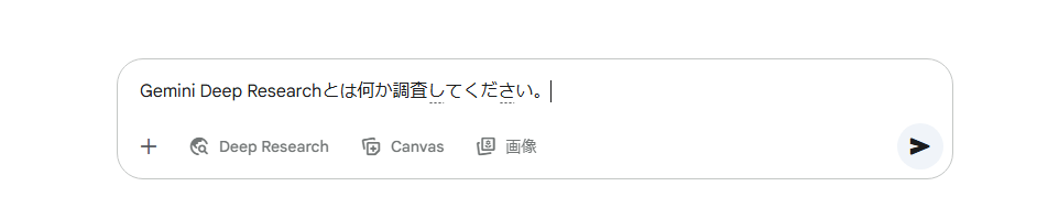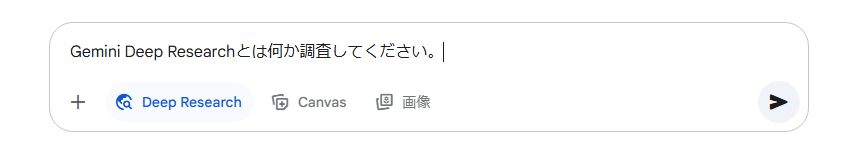 Deep Researchの選択テキストボックスの下に表示されている「Deep Research」をクリックして色が青く変化したのを確認し、▶を押す(ファイルや画像をアップロードする場合は「+」から選択する)