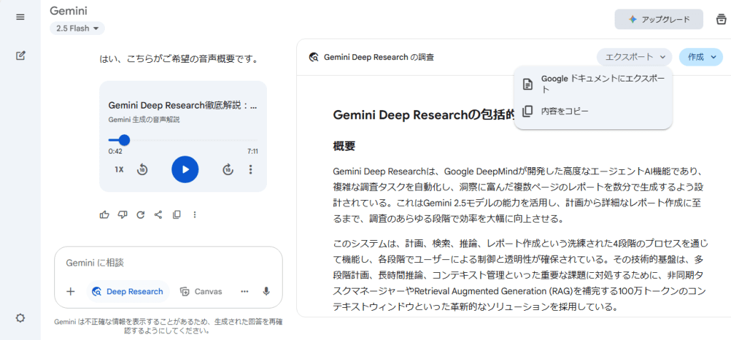 Gemini Deep Researchでは、レポート作成後音声概要を生成できます。