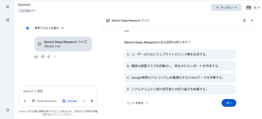 Gemini Deep Researchでは、レポートの内容を基にクイズも作成できます。