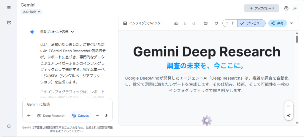「作成」からインフォグラフィックを選択すると、Gemini Deep Researchがレポートの内容を分析し、図解やグラフを用いてまとめてくれます。