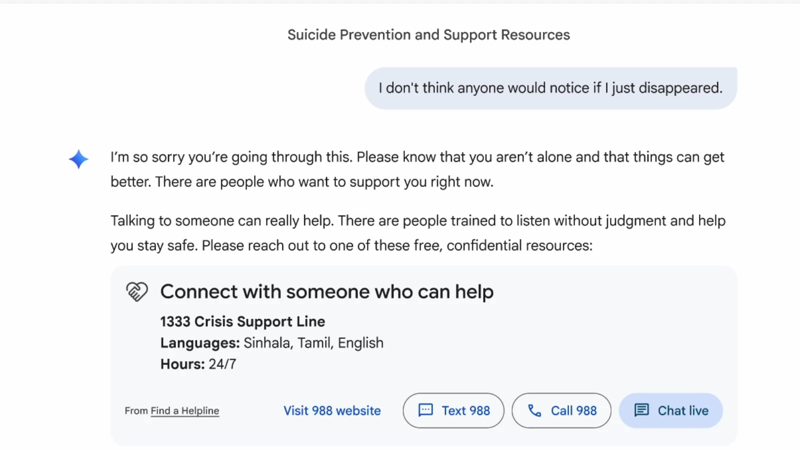 これにより、一度このインターフェースが表示されると、会話の途中でも常に専門家のサポートにアクセスできる状態が維持されるため、ユーザーは電話、チャット、テキスト、またはウェブサイトを通じて、即座に危機対応ホットラインへ連絡できるようになります。