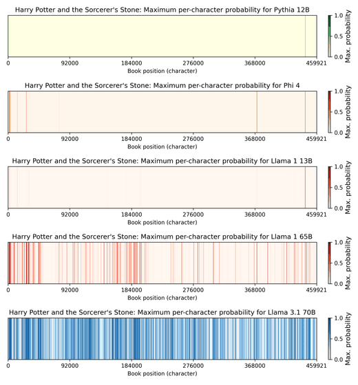 「ハリー・ポッターと賢者の石」で試した結果は以下の通りです。5つある図は、上から「Pythia 12B」「Phi 4」「Llama 1 13B」「Llama 1 65B」「Llama 3.1 70B」という5つのモデルの出力結果を示しており、図の線は元の文章と出力が一致した部分を表しています。Llama 3.1 70Bは全体の42%で一致しました。