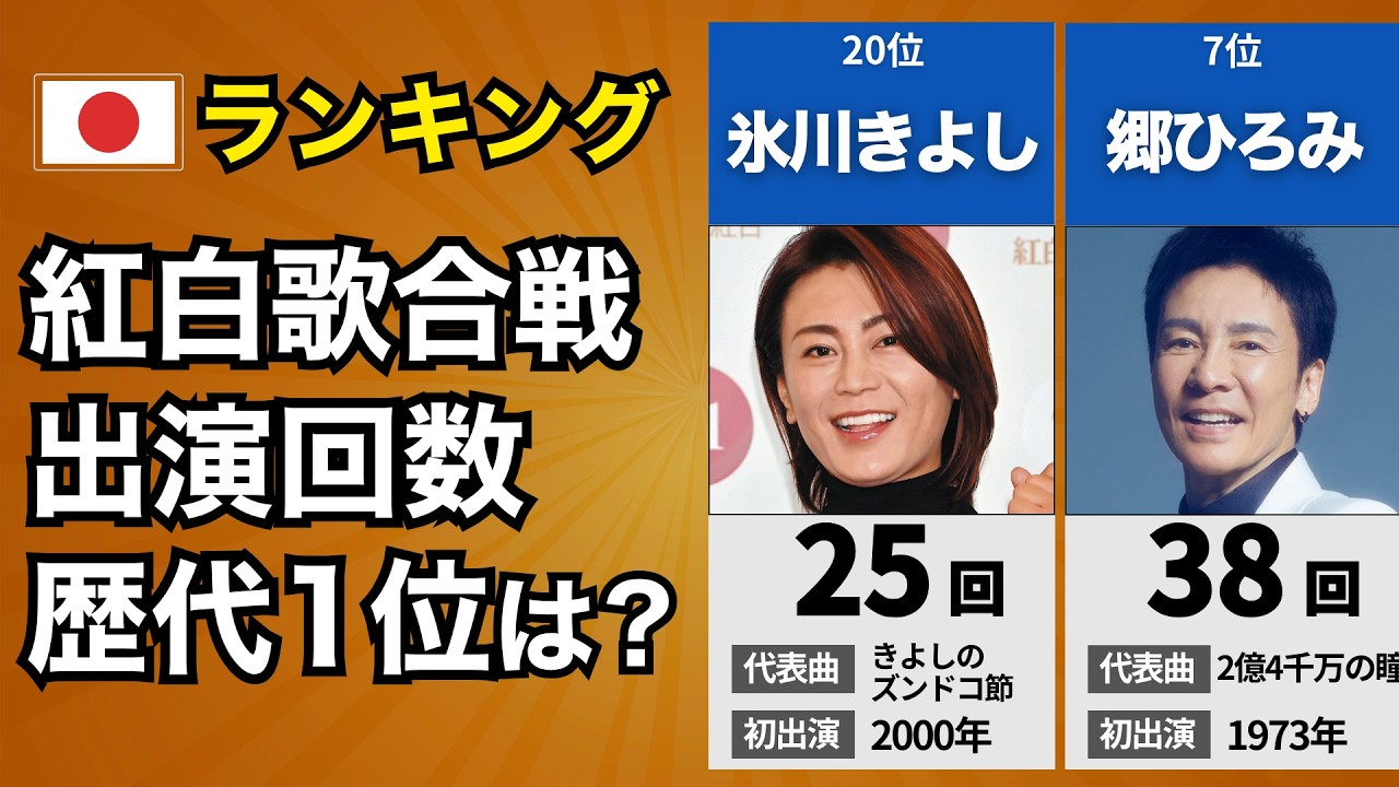 今回の動画では、NHK紅白歌合戦の歴代出場回数ランキング TOP20を紹介しています。