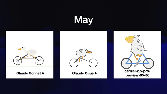 そして直近、2025年5月だとこんな感じ。「Claude Sonnet 4」はペリカンというかアヒルみたいな感じながら自転車に乗れています。そして、「gemini-2.5-pro-preview-05-06」は文句なしのペリカンを出力することに成功。
