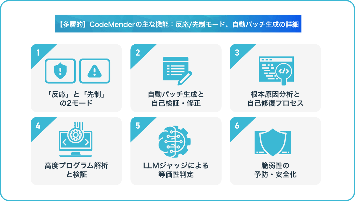 【多層的】CodeMenderの主な機能:反応/先制モード、自動パッチ生成の詳細