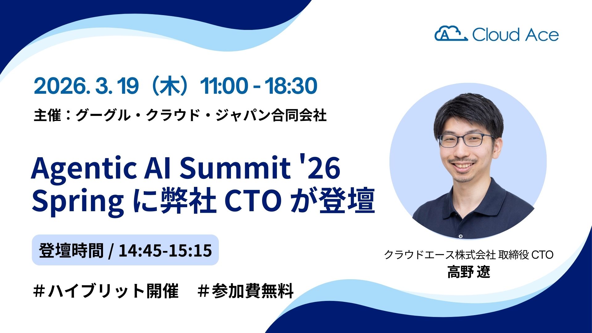 クラウドエースは、2026 年 3 月 19 日(木)に Google Cloud が主催する Agentic AI Summit ’26 Spring に協賛いたします。クラウドエースはスポンサー セッションとして、「Gemini CLI でみんなが使える Agent をつくってみた」をテーマに、弊社取締役 CTO の高野遼が登壇し、Agent 開発の実践的な取り組みをご紹介いたします。