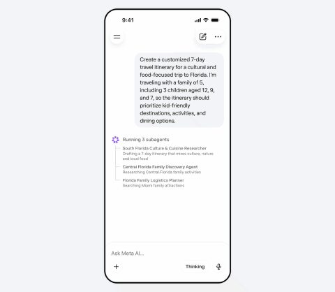 Muse Sparkは、小型かつ高速でありながら、科学・数学・健康などに関する複雑な質問に対応する推論能力を備える。Meta AIでは、複雑な推論やマルチモーダルタスクをサポートし、タスクに応じてモードを切り替えられるほか、複数のサブエージェントが並行して質問に取り組める。