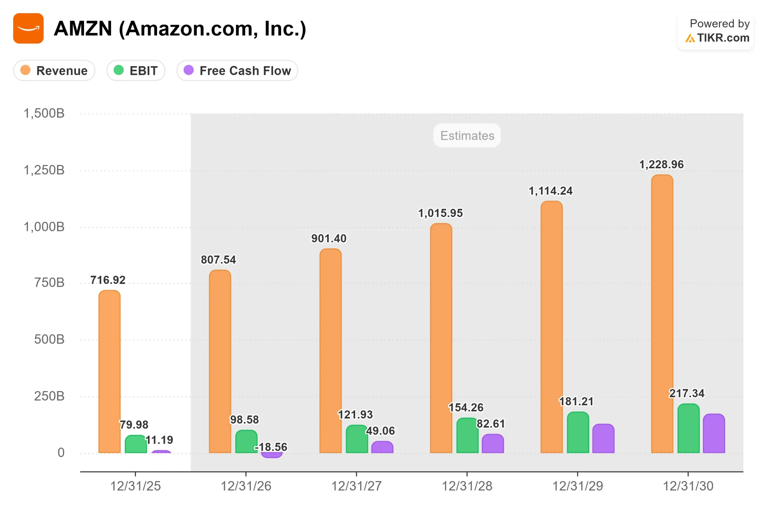 AMZN株の収益、EBIT、フリーキャッシュフローの予想(単位:10億ドル) (TIKR)