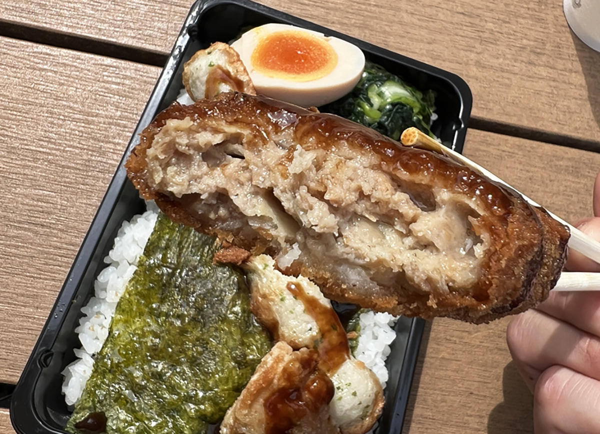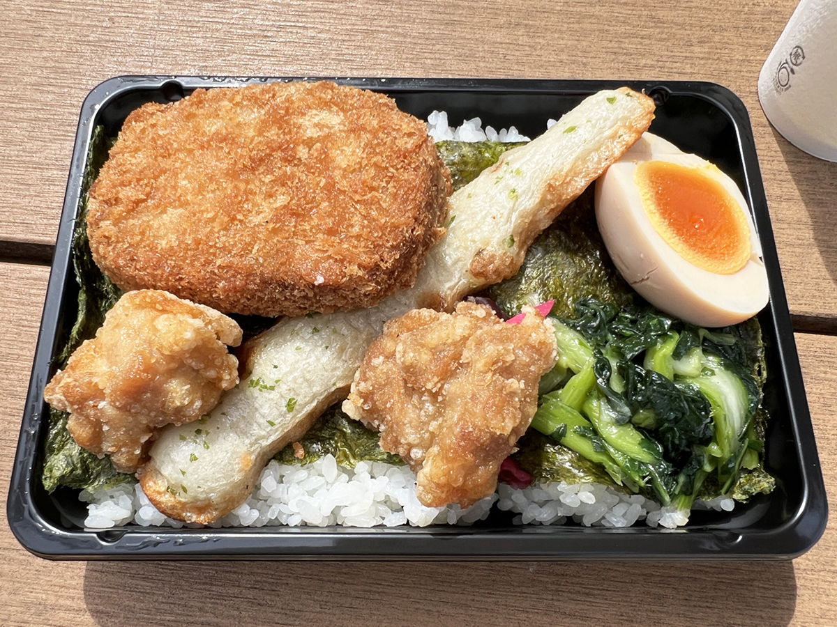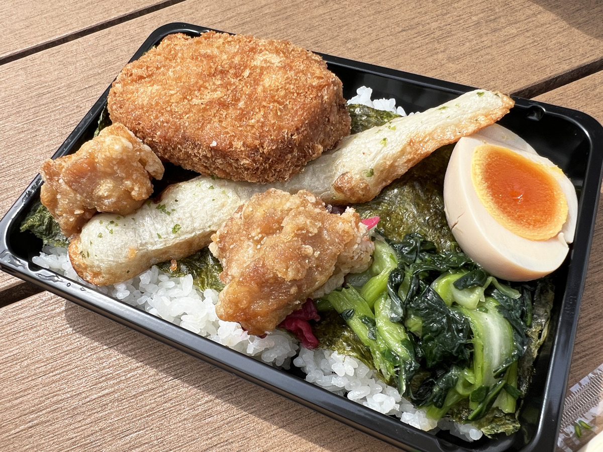 ベンチに座ってフタを開けてみると、海苔ご飯にライドオンするのは、ちくわ天、鶏唐揚げ2個、メンチカツ、ゆで卵というラインナップ。海苔弁としては豪華だけど、1100円という価格に釣り合っているのかはまだ納得できない。そこで食べてみたところ……