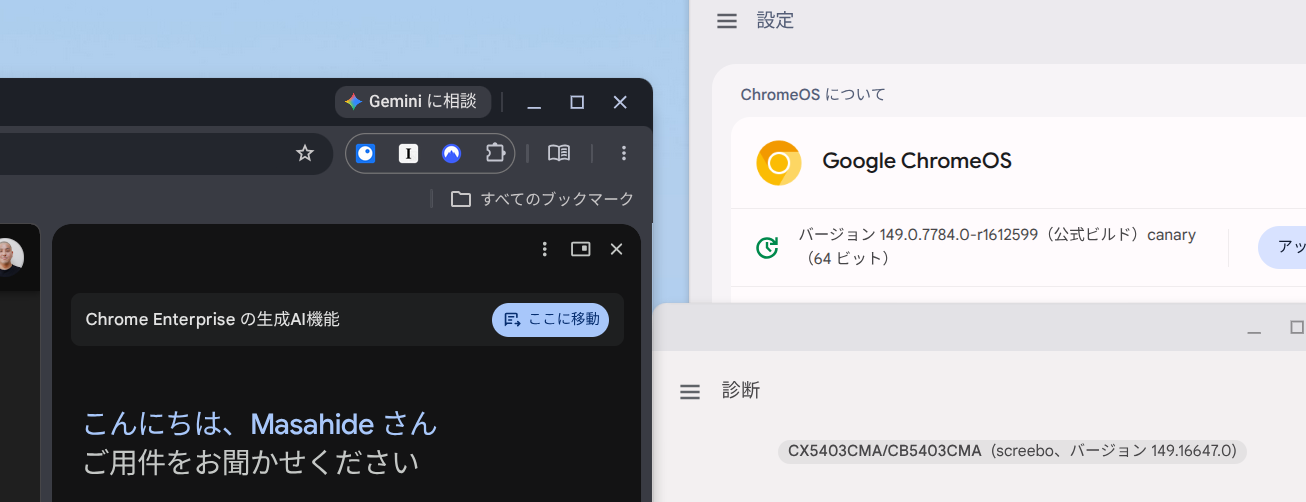 Google が昨年から段階的に展開している Chrome ブラウザに統合された「Gemini in Chrome (ブラウザの Gemini に相談)」が、ChromeOS 149 Canary を実行する Chromebook Plus において、日本語環境でも利用可能になったことを確認しました。