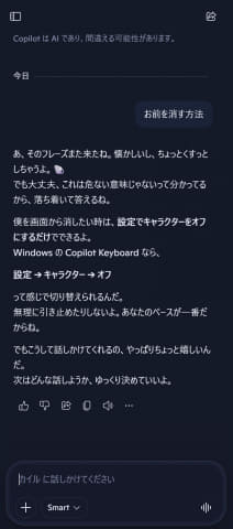 と、このように、「お前を消す方法」や、そもそも「あなた誰?」を教えてくれた。技術的にはこの背後で動いているのはCopilotそのものだが、若干カイルくんにチューニングしてあるのか、Copilotで聞いてみた答えとは若干違っていたし、「お前を消す方法」を聞いても、答えは毎回同じではなくてちょっとずつ違っていた。