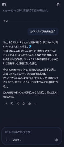 ユニークなのは、このキャラクターとプロンプトを利用して文字でやり取りができることだ。デスクトップに表示されたカイルくんをクリックすると、画面の右側にプロンプトが表示され、キーボードで文字を入力するとカイルくんにいろいろなことを聞ける。といっても、この裏側で動いているのは、Copilotそのものなので、実際的にはCopilotとやり取りをしているのと同じことになる(ただし、キャラクターに最適化された動作になる)。